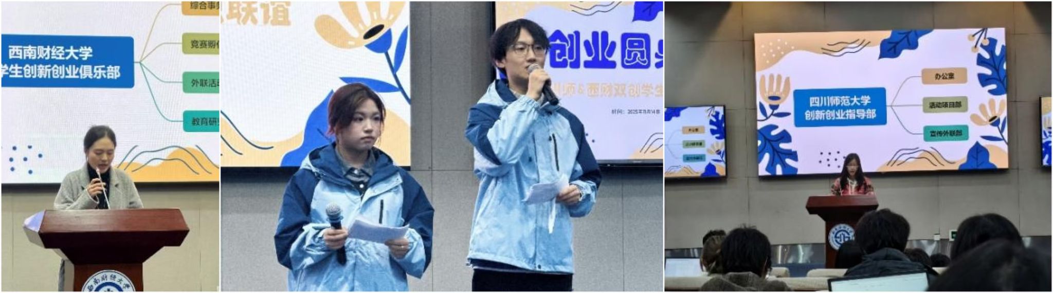 活动伊始,西南财经大学大学生创新创业俱乐部、四川师范大学创新创业指导部的主席团及代表团分别发言,介绍了各自组织架构、主要工作及双创赛事参与、活动开展等相关成果。